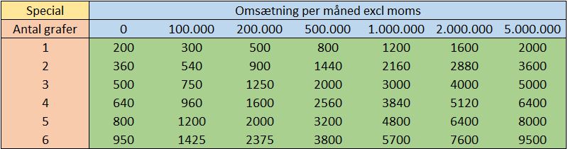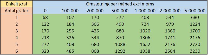 Pris efter gennemsnitlig omsætning per måned og ønskede antal grafer.Min pris per graf 32kr, Løbetid 6md